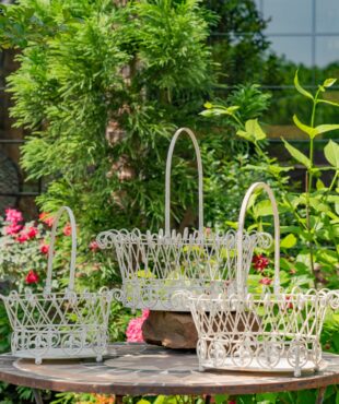 × 43 inch tall multi-tier blossom shaped birdbath garden stake in antique copper finish with dangling lily-shaped bell 43.75" Tall Multi-Tier Blossom-Shaped Iron Birdbath Garden Stake "Camellia" $124.95